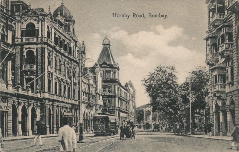 Street scene showing buildings, a tram, horse-drawn carriage, and pedestrians.