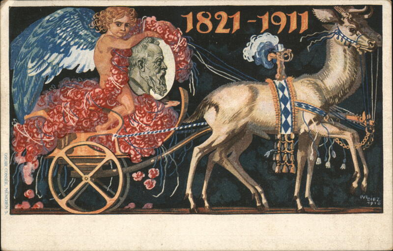 Art Nouveau illustration featuring a cherub holding a portrait wreath in a flower-laden chariot pulled by an ornate deer. Commemorates 1821-1911.