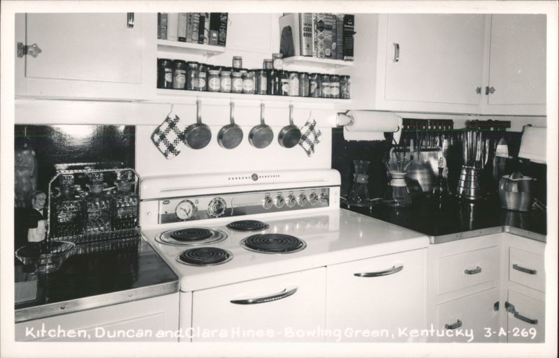 | Interior view of a kitchen featuring a General Electric Stratoliner electric stove with four burners, white cabinets, dark countertops with metal edging. Spice jars are visible on shelves above the stove, and copper pans hang below. Various small appliances like a blender, coffee maker, and juicer are on the counter. A set of crystal decanters sits next to the stove. |