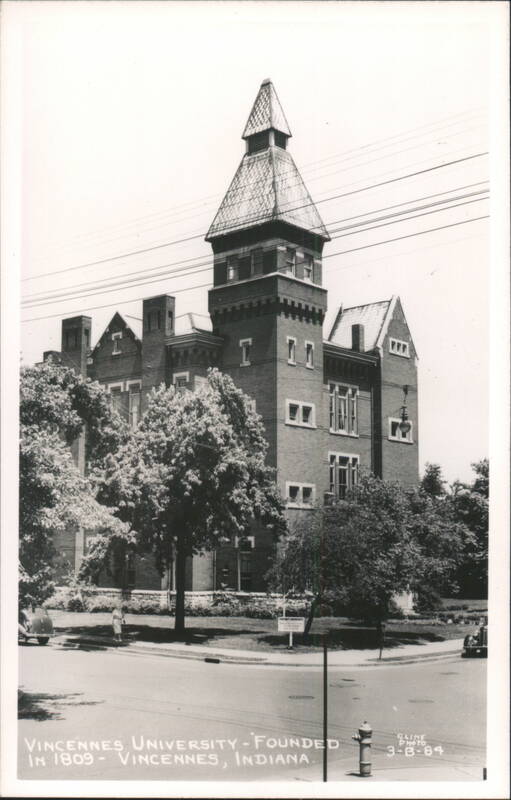 Exterior view of a large brick university building with a prominent central tower, seen from a street corner. Trees line the street and are in front of the building. A fire hydrant is visible in the foreground.