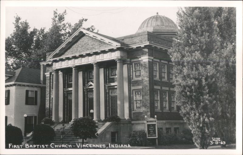 | Exterior view of a large brick church building featuring prominent columns, a pediment, stained glass windows, and a dome. A sign in front reads "HE LIVES WISELY WHO LIVES RIGHTEOUSLY". A house is visible to the left, and trees frame the scene. |