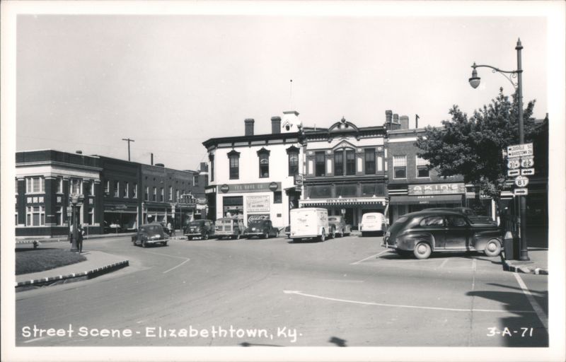| View of a downtown street corner showing several businesses including Lex Drug Co. (with Coca-Cola signs and advertising a Luncheonette, Ice Cream, and Fountain Service), Geo. W. Rihn & Co., and Akin's ("For Smarter Things"). Several vintage cars are parked along the street. Street signs indicate directions and distances to Louisville (50) and Bardstown (26) via US routes 31W and 62, and KY route 61. A pedestrian walks on the sidewalk near a lamppost. |