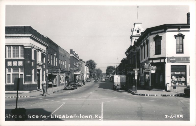 | View looking down a main street lined with brick buildings and businesses. Vintage cars are parked and driving. Signs visible include Lex Drugs (Rexall, Soda-Lunch, Buttermann Ice Cream, Coca-Cola), J.E. Wise, Western Union, Enleys Refrigerated Service truck, Cafe, Louisville Store Joplit & Lanz Inc., Taylor, and Phillips Optical Dept. US Route signs 62 and 31 are posted. |