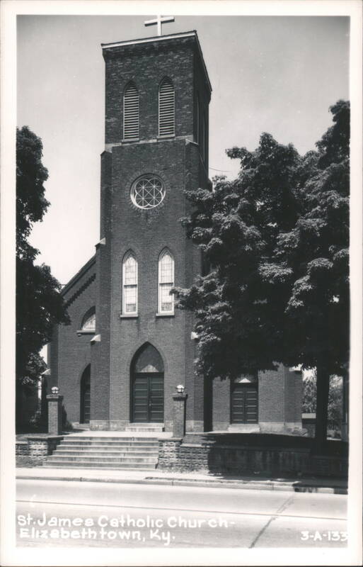 Exterior view of a brick church building with a prominent bell tower topped with a cross. Features include arched windows, a large round window, and steps leading to the main entrance. Trees are visible on both sides of the building.