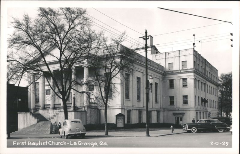 Large church building with classical columns and a prominent staircase. Bare trees are in the foreground. Vintage cars are parked on the street corner. People are seen on the stairs. Power lines cross overhead.