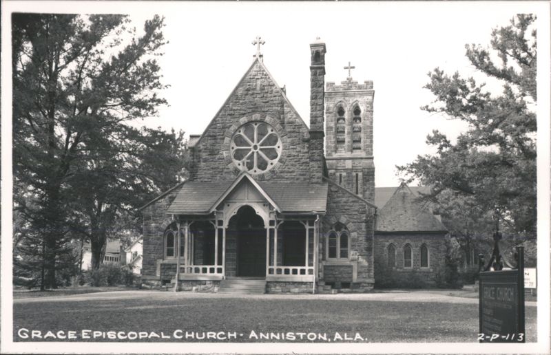 Stone church building with a large rose window over a covered entrance porch, and a bell tower to the right. Surrounded by large trees, with a sign for "GRACE CHURCH" in the foreground.