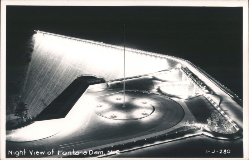 Large concrete dam illuminated by lights at night. A circular plaza with a flagpole and surrounding lights is visible in the foreground. A roadway runs along the top crest of the dam.