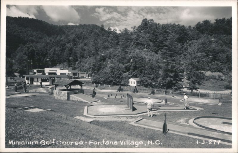 People playing on a miniature golf course, with buildings and a wooded hill in the background.