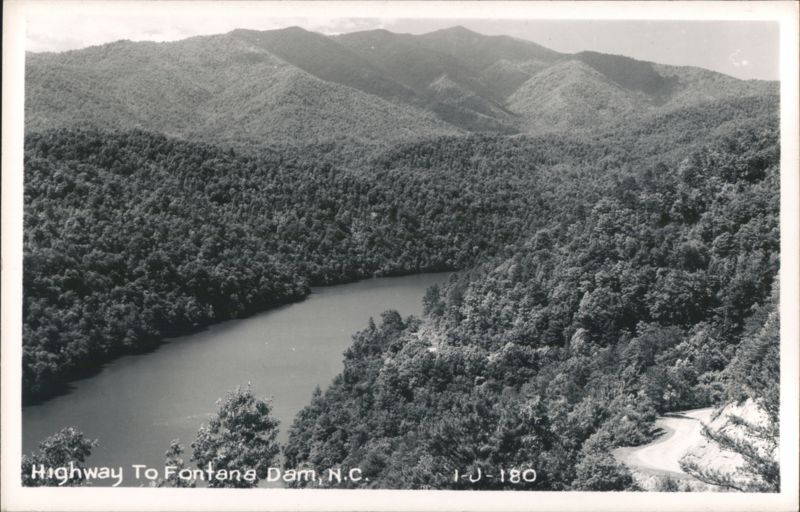 View overlooking a river or lake winding through densely forested mountains. A road curves along the hillside in the foreground.