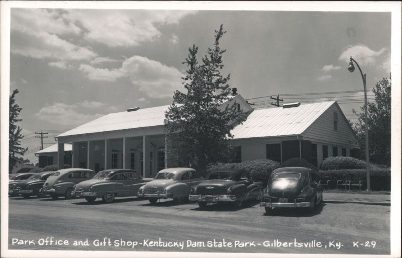 View of the Park Office and Gift Shop building with several vintage automobiles parked in front.