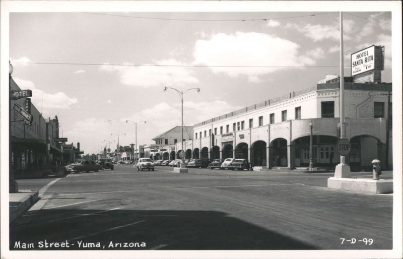 | View looking down Main Street with parked and moving cars from the era. Buildings line both sides of the street, including the Hotel Santa Rita with a large rooftop sign and the Hotel Yuma / Loan & Finance Co. building. Streetlights, power lines, a stop sign, and a fire hydrant are visible. The building on the right features arched walkways. |