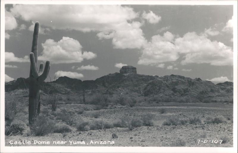 Desert landscape featuring a large saguaro cactus in the left foreground. In the background are rocky mountains, including the prominent Castle Dome butte, under a partly cloudy sky.