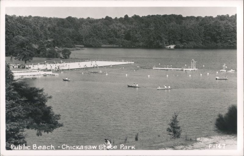 View of a lake with a designated swimming area marked by docks and buoys. Numerous people are swimming, sunbathing on the docks, and rowing boats on the water. A forested hill lines the far shore.