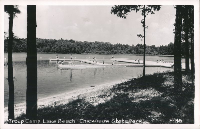 People swimming and sunbathing on a floating dock in a lake surrounded by trees.