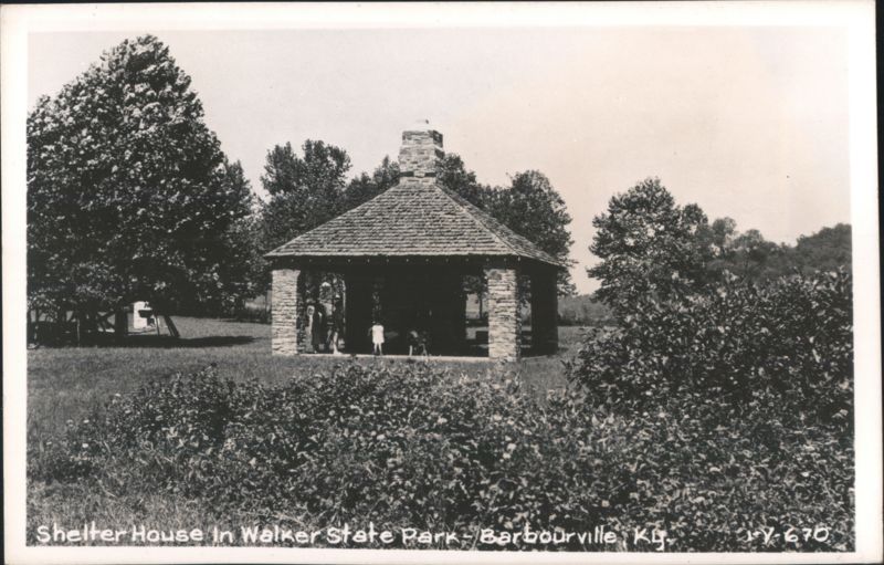 Stone shelter house with a shingled roof and chimney in a park setting. Trees and bushes surround the structure. Several people are visible inside the open shelter.
