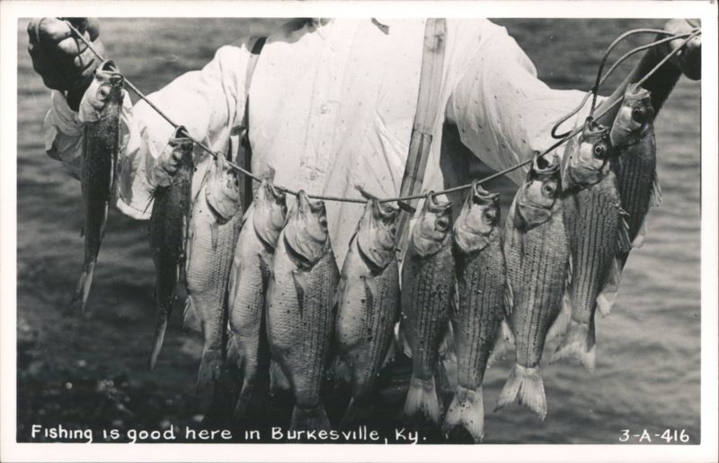 Man Holding Stringer Full of Fish, "Fishing is good here"