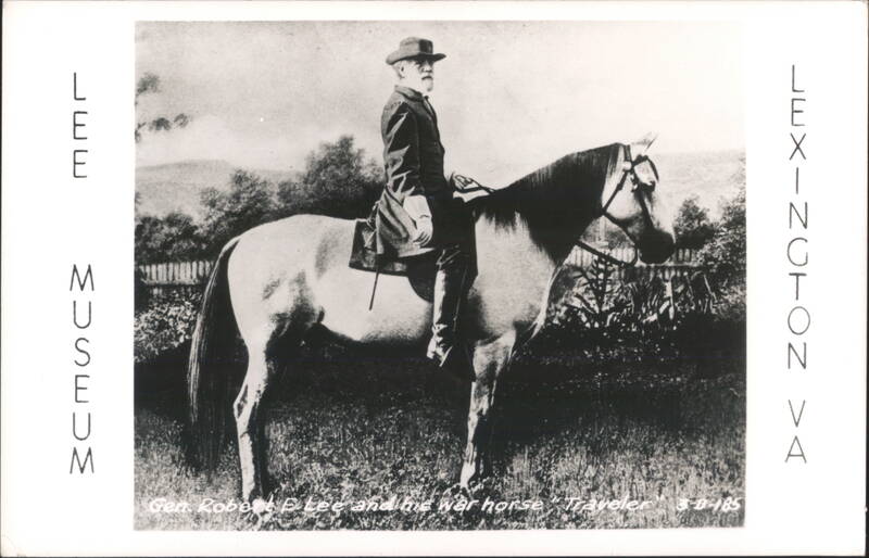 Black and white photograph of General Robert E. Lee sitting atop his horse, Traveler, outdoors. Lee is wearing a hat and coat. Text on the left reads "LEE MUSEUM". Text on the right reads "LEXINGTON VA".