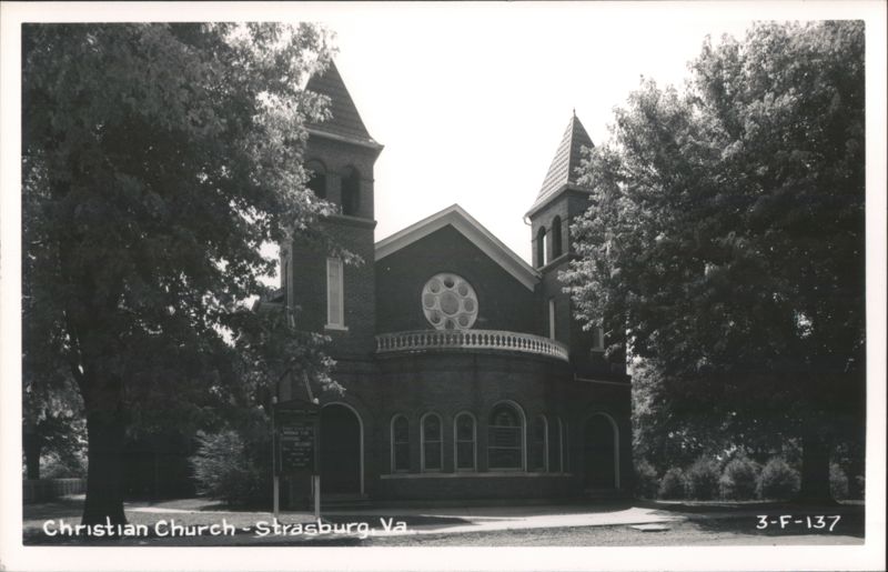 | Brick church building featuring two square towers with pyramidal roofs, a central gable with a large rose window above a curved section with arched windows and a balustrade. A sign is visible near the entrance, and large trees frame the building. |