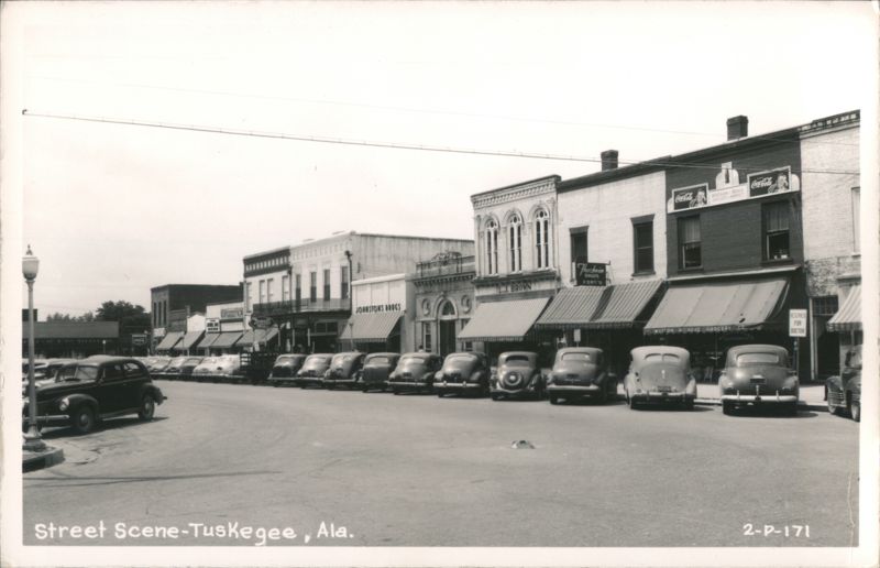 | Black and white street view with numerous cars parked diagonally along the curb. Storefronts visible include Johnstons Drugs, L.J. Brown, Florsheim Shoes, Fort's, and Watson & Ross Grocery Market. Coca-Cola signs are visible on the grocery store. A sign indicates parking "Reserved for Doctor". |