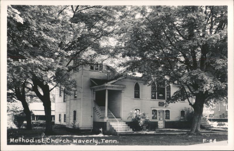 Exterior view of a wooden Methodist church building with arched windows and an external staircase leading to a covered porch. The building is surrounded by large, leafy trees.