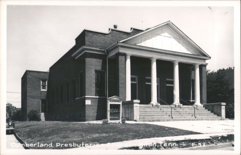 | Brick church building with a classical portico featuring four white columns supporting a pediment. Concrete steps lead up to the entrance. A sign in front reads 'CUMBERLAND PRESBYTERIAN' and includes biblical quotes 'BECAUSE I LIVE YE SHALL LIVE ALSO' and 'WHO SO EVER WILL'. A grassy lawn and sidewalk are in the foreground. Part of an older car with license plate 13-311 is visible on the far left. |