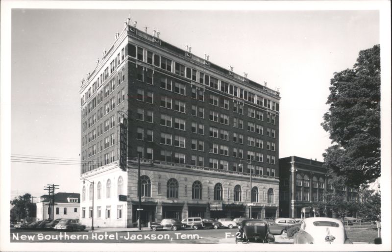 Exterior view of the multi-story brick New Southern Hotel building. Several vintage cars are parked on the street in front and to the side of the hotel. A street lamp is visible on the corner. Another building is partially visible to the right. |