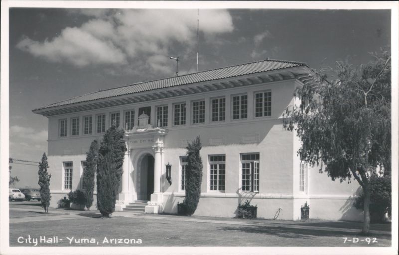 Exterior view of the two-story Yuma City Hall building with a tiled roof, arched entrance with columns, and surrounding trees and lawn. Cars are visible parked in the background.