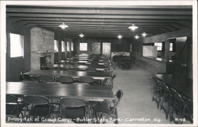 Interior view of a rustic dining hall featuring long wooden tables arranged in rows with folding chairs. Exposed wooden beams support the ceiling, from which several lights hang. A large stone fireplace is visible on the left wall, alongside several windows. A serving counter area is located along the right wall. |