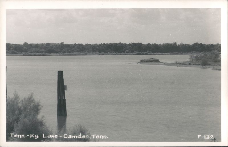 A wide view across the water showing a wooden piling in the foreground, a small island or spit of land in the mid-ground, and the tree-lined far shore.