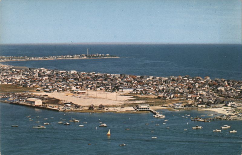 | Looking down on one of the finest recreational areas in the country, Hampton Beach, N. H. Foreground shows the fishing fleet Harbor, just beyond the business district and shore line which provides the well known and most highly regarded bathing beach. |