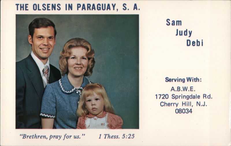 Front: THE OLSENS IN PARAGUAY, S. A. Sam "Brethren, pray for us. 1 Thess. 5:25 Judy Debi Serving With: A.B.W.E. 1720 Springdale Rd. Cherry Hill, N.J. 08034 Back: The Shevelands, P.O. Box 1101, Elkhart, Ind. 46514