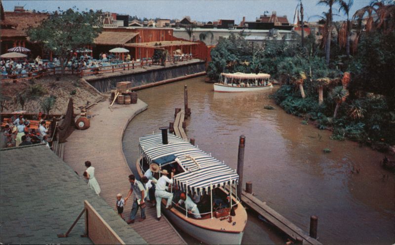 | All ashore from a trip down the 'Rivers of the World' as the tropical steamers stop to land passengers at the Adventureland port in DISNEYLAND. The river banks abound with plants native to the tropics and life-like 'animals' lurk in the river waters. |