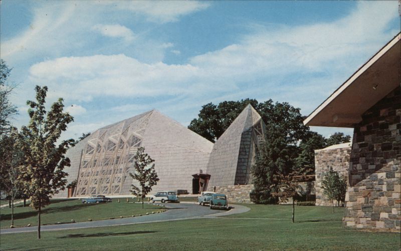 15663-B STAMFORD, CONN. First Presbyterian Church. The floor plan of the Sanctuary is in the shape of a fish which was an early Christian symbol. Pub. by NATCORE_CB Natural Color Cards Co., Ridgefield Park, N. J. BADE BY WEST NTACE. N. Y. 10 HERE