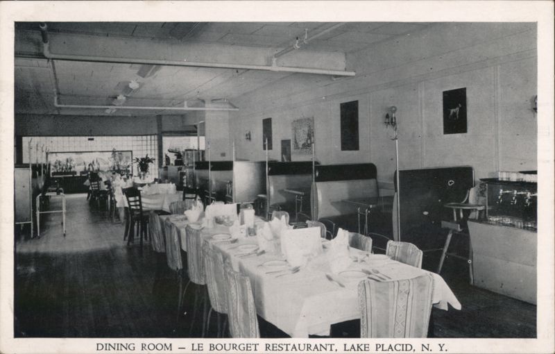 Front: DINING ROOM LE BOURGET RESTAURANT, LAKE PLACID, N. Y. Back: BOURGET GO LE BOURGET RESTAURANT LAKE PLACID, N. Y. RESTAURANT BAR LE BOURGET PUBL. BY ADLER ADVERTISING, BINGHAMTON, N. Y. we stamp and mail