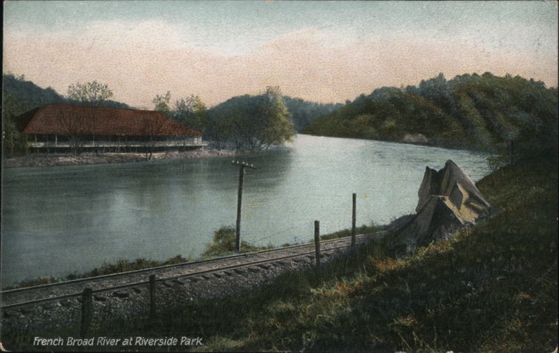 Front: French Broad River at Riverside Park. Back: HACKNEY & MOALE CO., ASHEVILLE N.C., PUBLISHERS. MADE IN GERMANY. №: 6251 Bost Card. One Cent for United States, and Island Possessions, Cuba, Canada and For Foreign. THIS SPACE FOR ADDRESS ONLY.