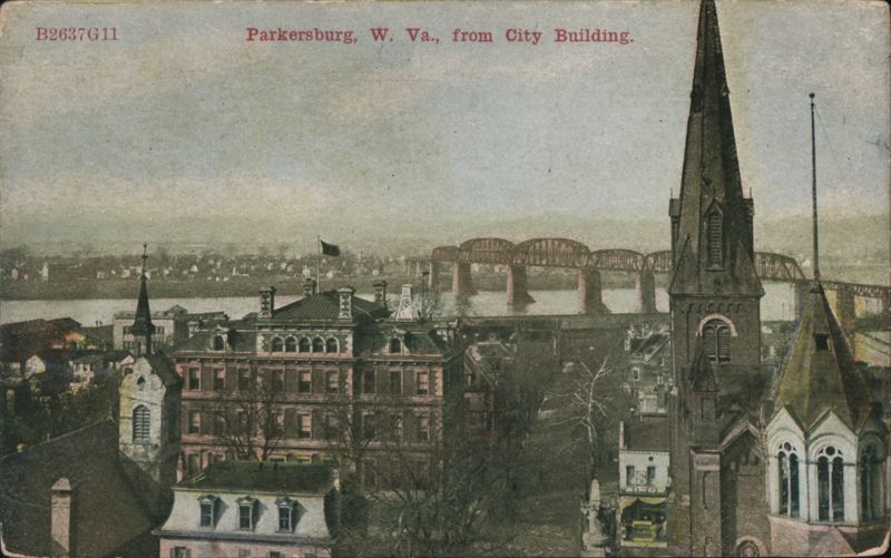 Front: B2637G11 Parkersburg, W. Va., from City Building. Back: ZIM garbling vdio mort SV W grud The right hand side must be reserved for stamp and address. 50% THE A DRESS TO BE WRITTEN ON THIS SIDE. 1198998 Published by H G. Zimmerman & Co. Chicago