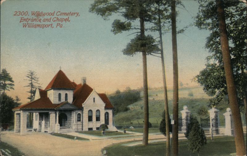 Front: 2300. Wildwood Cemetery, Entrance and Chapel, Williamsport, Pa.. Back: .AR.1165 STAMPHERE Two CENTS