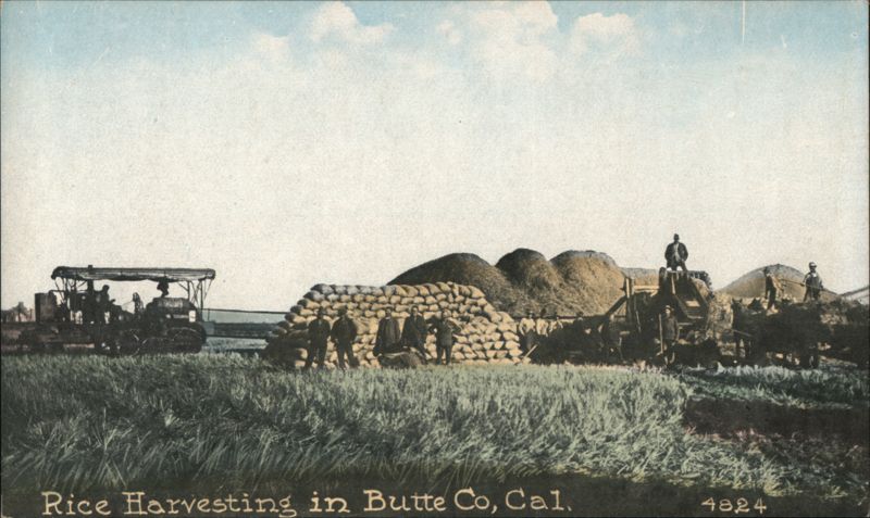 Workers harvesting rice using early farm machinery, including a tractor and thresher. Large piles of bagged rice are visible.