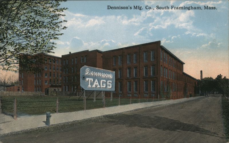 Exterior view of the Dennison Manufacturing Company factory buildings with a large 'Dennison's TAGS' sign in the foreground.