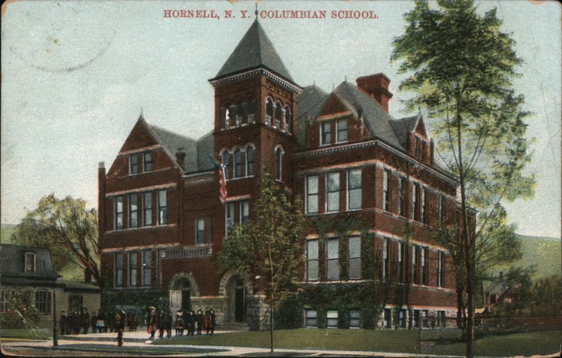 Front: HORNELL, N. Y. COLUMBIAN SCHOOL. Back: d = forget you! Cruestine E 7915 Nu Frank Castel To Stfeld 60 Office Montello Co mass. This side for the Address only.