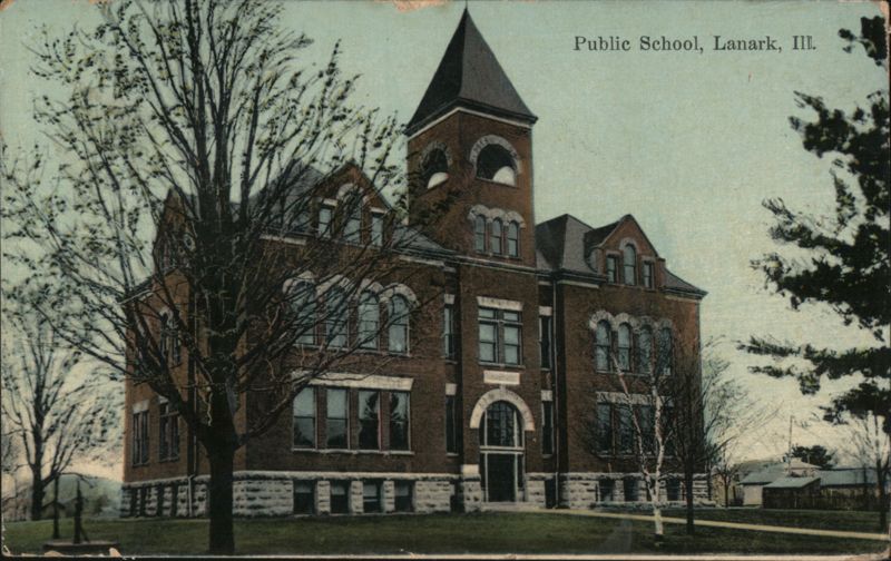 Front: Public School, Lanark, Ill. Back: JA18 2PM ТУП ILL I was all 4k, Mr & Mrssonberger was very cold and storming every thing last monday it We arrived home ONE CENTU Br & Mrsdbenry Detterman Tiffin chia