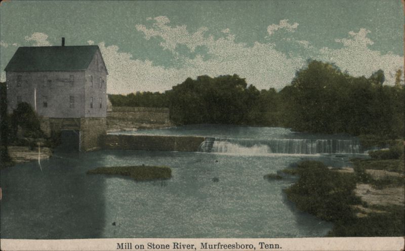 View of a mill building situated next to the Stone River, featuring a dam and waterfall.