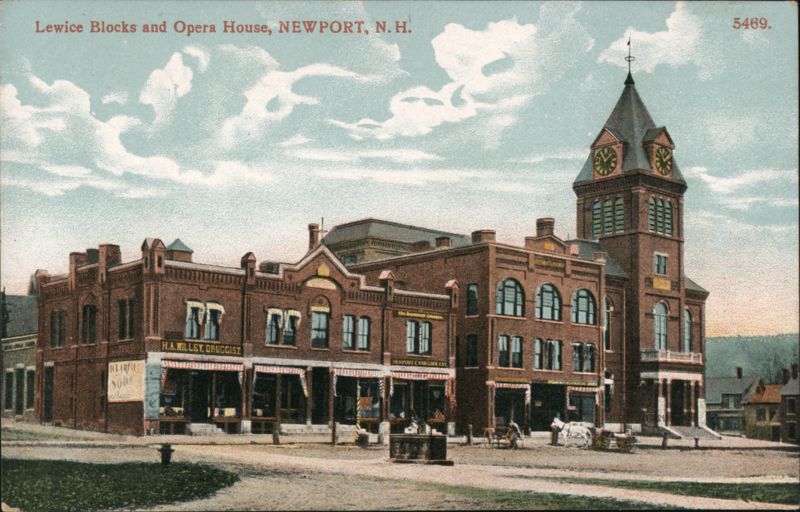 Front: Lewice Blocks and Opera House, NEWPORT, N. H. RR H.A.MILLEY DRUGGIST DS 5469. Back: это Made in Germany. Pub. by J. W. JOHNSON, Newport, N. H. is where yo لله san the da The doning Lun Nove Foreign