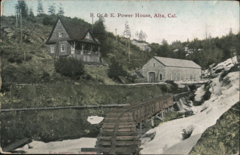 Front: P. G & E. Power House, Alta, Cal. E. C. KROPP CO., MILWAUKĘĘ. Back: THIS SPACE MAY BE USED FOR WRITING AWJIM .009908 GREAT BRITAIN FOREIGN: TWO CENTS.