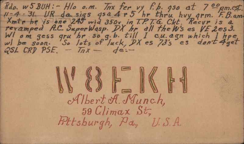 Rdo. w5 BUH:- Hlo o.m. Tnx fer vy fb. qso at 7pm.est.