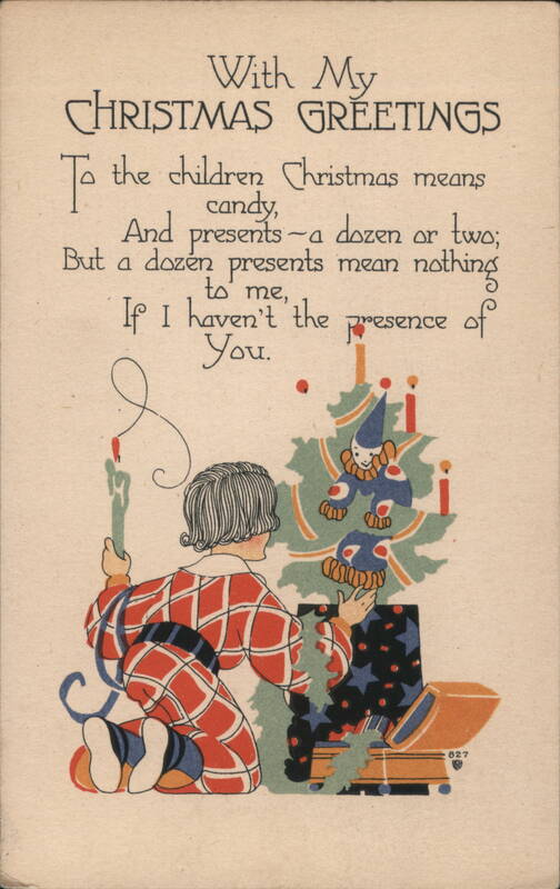 Front: With My CHRISTMAS GREETINGS To t the children Christmas means candy, And presents a dozen or two; But a dozen presents mean to me, If I haven't the nothing presence of and a 827 Back: PUBLISHED BY P.F.VOLLAND CO., CHICAGO # 827 20 200 .... P