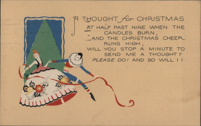 Poem reads: "A THOUGHT for CHRISTMAS AT HALF PAST NINE WHEN THE CANDLES BURN, AND THE CHRISTMAS CHEER RUNS HIGH, WILL YOU STOP A MINUTE TO SEND ME A THOUGHT? PLEASE DO! AND SO WILL I!". Illustration features a woman in a large decorated dress and a man in a Pierrot costume holding a red ribbon. |