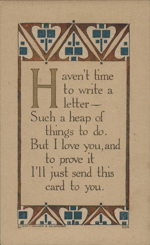 Front: VAVA aven't time to write a letter- Such a heap of things to do. But I love you, and to prove it I'll just send this card to you. 西瓜 JACJAC 1910.PF VOLLAND & CO CHICAGO 634 Back: 2- MARK ORIGINALITY VNITED STATES ES FOREIGN TWO CENTS...