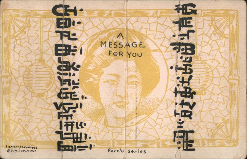 | Features an illustration of an Asian woman's face in a circle with the text "A Message For You" above and "Puzzle Series" below. Vertical columns of Asian characters flank the central image against a mosaic background. Copyright 1907 by M. Stein, Chicago. |