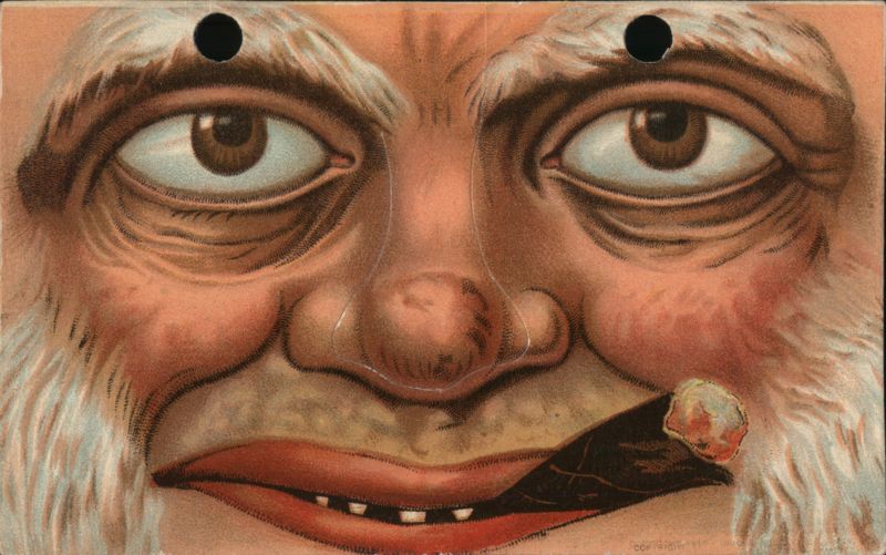 Illustrated close-up of a man's face with large eyes, white beard, and a cigar. Two holes are punched above the eyes, indicating it's a mask.